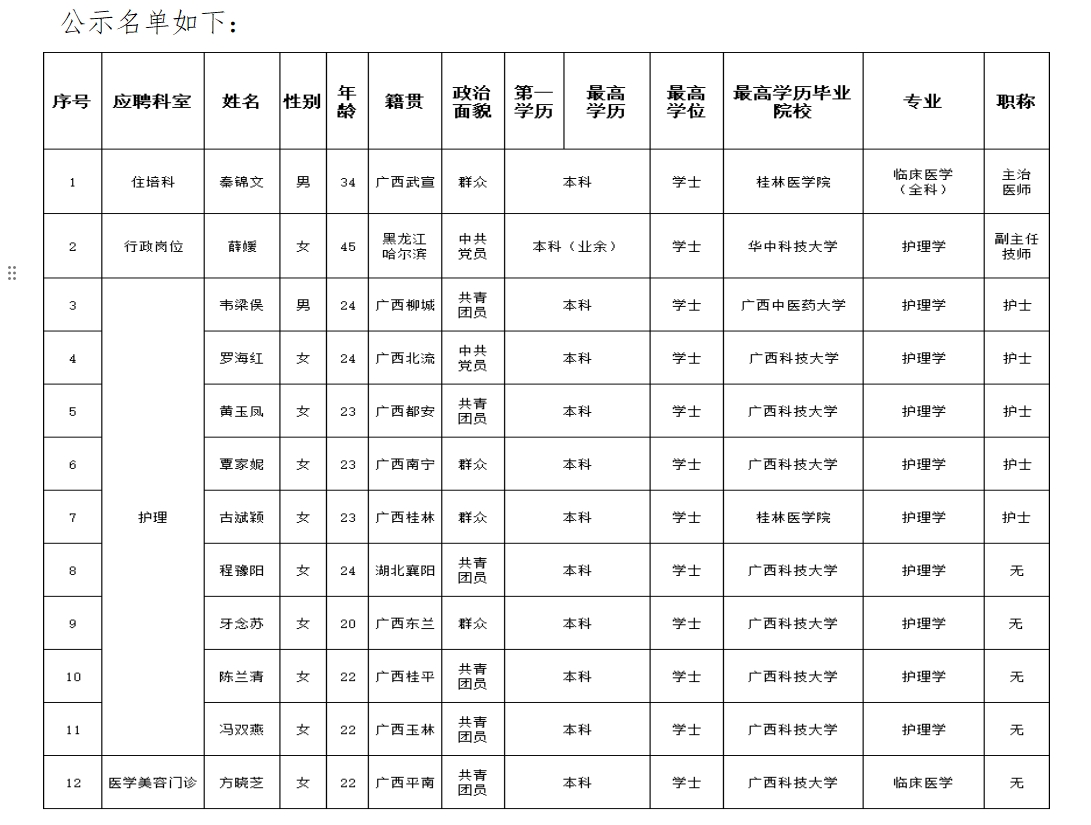 根据医院人员招聘制度,应聘我院行政、护理、临床医疗岗位的秦锦文等12位同志通过医院面试、考核合格。经研究决定,同意确定秦锦文等12位同志为拟聘用人员,现予以公示五个工作日,公示时间从2025年4月27日至2025年5月6日。对公示内容如有异议,请以书面形式,并署真实姓名和联系地址,于2025年5月6日前投至公示栏旁意见箱,邮寄、直接送至人事科。地址:柳州市跃进路126号实验综合楼二楼人事科,联系电话:0772-2514419。