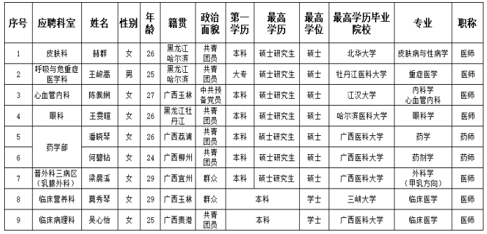 根据医院人员招聘制度,应聘我院临床医疗、医技岗位的赫群等9位同志通过医院面试、考核合格。经研究决定,同意确定赫群等9位同志为拟聘用人员,现予以公示五个工作日,公示时间从2025年6月5日至2025年6月11日。对公示内容如有异议,请以书面形式,并署真实姓名和联系地址,于2025年6月11日前投至公示栏旁意见箱,或邮寄、直接送至人事科。地址:柳州市跃进路126号实验综合楼二楼人事科,联系电话:0772-2514419。