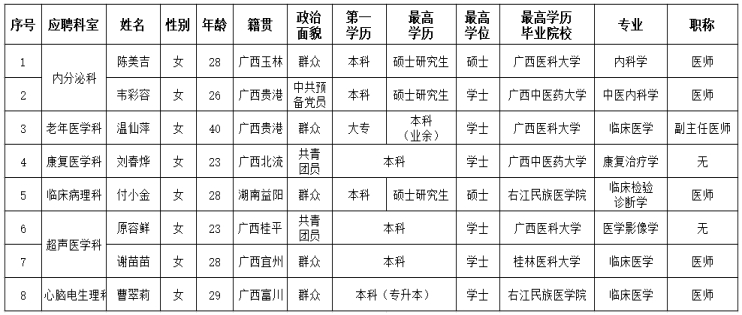 根据医院人员招聘制度,应聘我院临床、医技医疗岗位的陈美吉等8位同志通过医院面试、考核合格。经研究决定,同意确定陈美吉等8位同志为拟聘用人员,现予以公示五个工作日,公示时间从2025年7月18日至2025年7月24日。对公示内容如有异议,请以书面形式,并署真实姓名和联系地址,于2025年7月24日前投至公示栏旁意见箱,或邮寄、直接送至人事科。地址:柳州市跃进路126号实验综合楼二楼人事科,联系电话:0772-2514419。