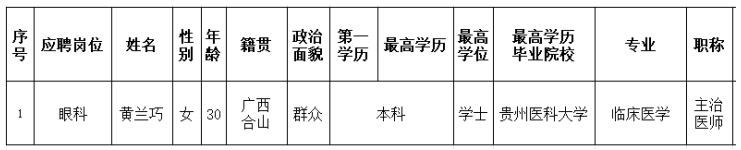 根据医院人员招聘制度,应聘我院临床医疗岗位的黄兰巧同志通过医院面试、考核合格。经研究决定,同意确定黄兰巧同志为拟聘用人员,现予以公示五个工作日,公示时间从2025年9月8日至2025年9月12日。对公示内容如有异议,请以书面形式,并署真实姓名和联系地址,于2025年9月12日前投至公示栏旁意见箱,或邮寄、直接送至人事科。地址:柳州市跃进路126号实验综合楼二楼人事科,联系电话:0772-2514419。