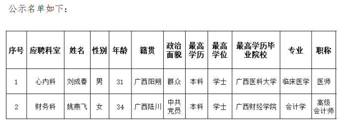 根据医院人员招聘制度,应聘我院临床医疗、行政岗位的刘成春、姚燕飞2位同志通过医院面试、考核合格。经研究决定,同意确定刘成春、姚燕飞2位为拟聘用人员,现予以公示五个工作日,公示时间从2025年10月13日至2025年10月17日。对公示内容如有异议,请以书面形式,并署真实姓名和联系地址,于2025年10月17日前投至公示栏旁意见箱,或邮寄、直接送至人事科。地址:柳州市跃进路126号实验综合楼二楼人事科,联系电话:0772-2514419。