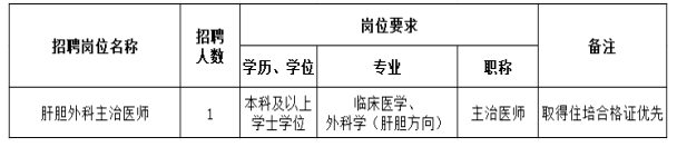 根据医院发展需要,现面向社会急招肝胆外科主治医师1人,有关招聘事项公告如下: