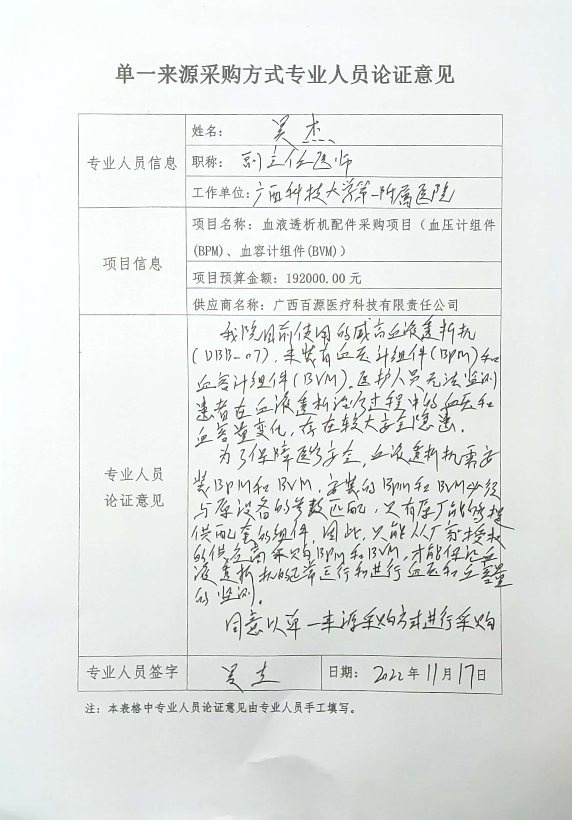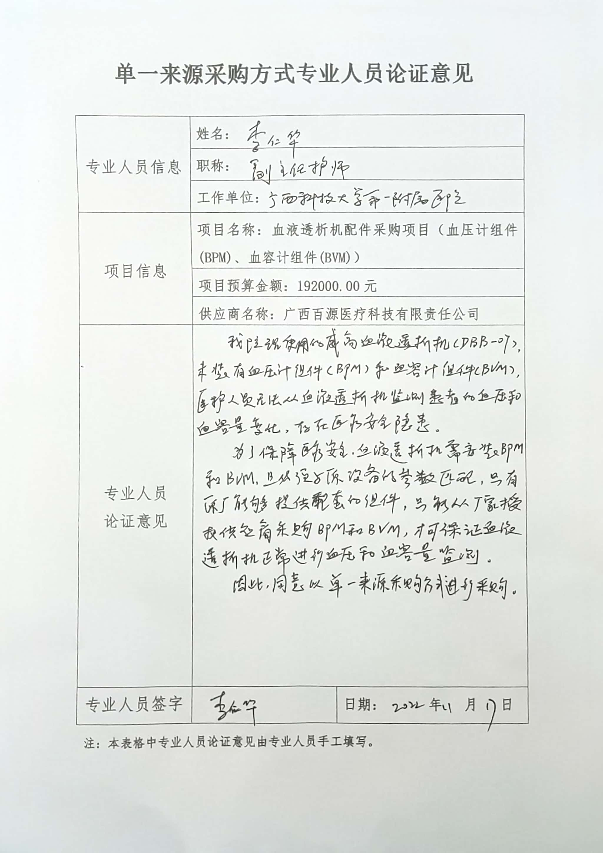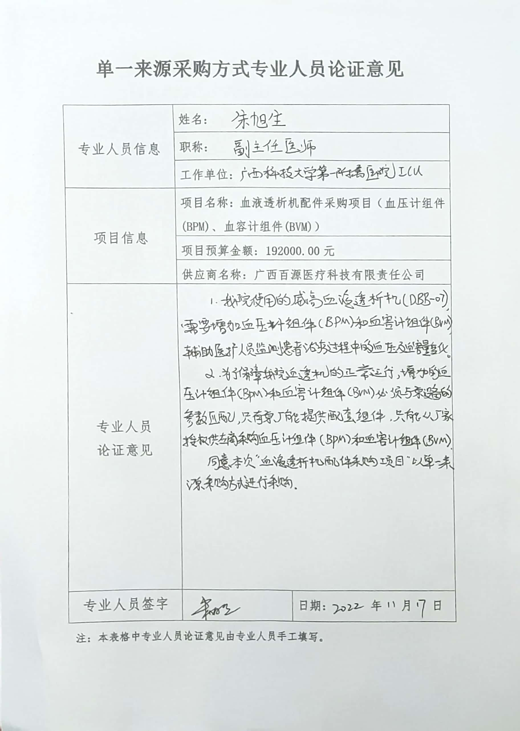 广西科技大学第一附属医院就肾内科血透在线监测设备(血压监测)、(血容量监测)采用单一来源方式采购,该项目服务拟由广西百源医疗科技有限责任公司承担。现将有关情况向潜在供应商征求意见。征求意见期限从2022年11月28日起至2022年12月5日止。