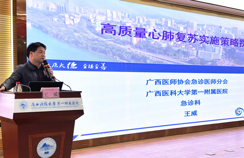 培训班邀请了区内广西医科大学第一附属医院王威教授,广西医科大学第二附属医院郑晓文教授分别作了题为《高质量心肺复苏实施策略探讨》、《急诊常见中毒的救治策略》的专题讲座;