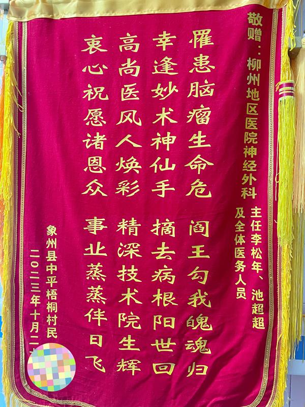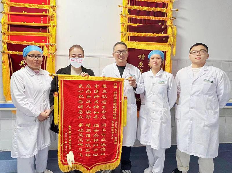 “罹患脑瘤性命危,阎王勾我魂魄归。幸逢妙术神仙手,摘去病根阳世回。高尚医风人焕彩,精深技术院生辉......”这天,一面承载着患者和家属满满谢意的锦旗送到了神经外科医务人员的手上。这一面锦旗凝聚着一份温暖、一份认可、一份信赖、更是一份责任。看到神采奕奕的覃爷爷正谈笑风生,更是让我们倍感欣慰。