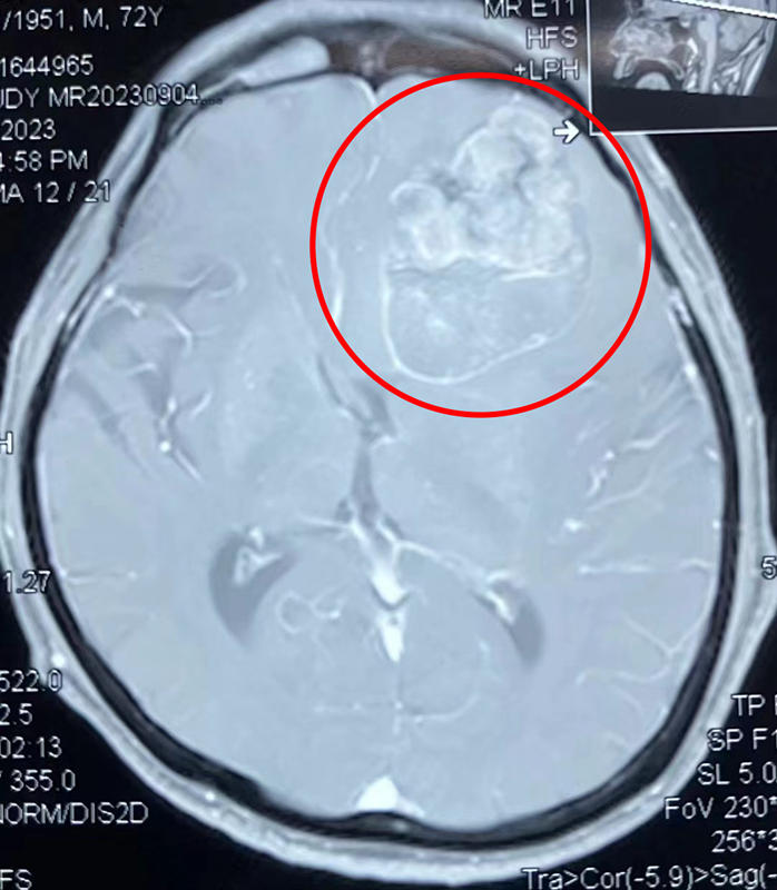 半年前,72岁的覃爷爷突然变得懒言少语,喜卧床,对常识问题不能回答;为求诊治,覃爷爷的家属带着他来到了广西科技大学第一附属医院门诊就诊,初步检查后以“颅内占位性病变”收住我科。入院后进一步完善影相关检查,高度怀疑患者系“颅内黑色素瘤(转移瘤)”,由于肿瘤侵犯大脑功能区,患者出现头痛、失语、反应力、记忆力明显减退、性格行为改变等临床表现。