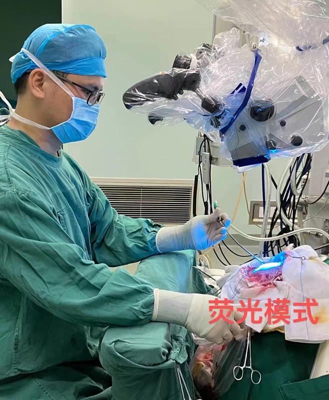 术中通过荧光引导脑肿瘤组织染色,使用特定波长的光线照射肿瘤部位,恶性肿瘤随即显影,医生根据自身经验和荧光辅助来确定肿瘤的边界,最大程度地将肿瘤切除。