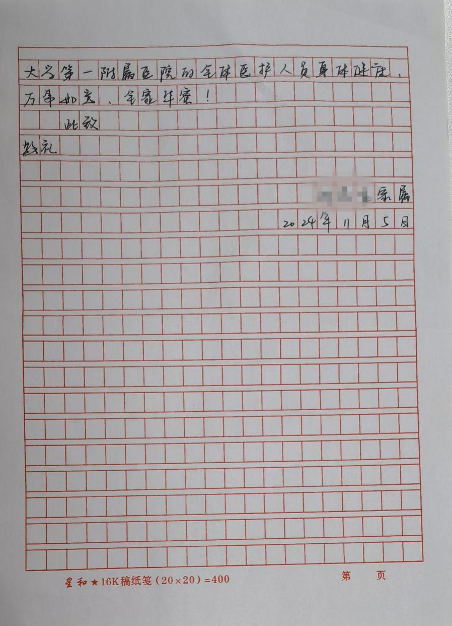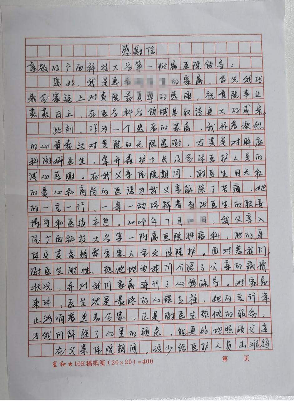 这是一封沉重的感谢信,也是一个儿子对父亲厚重的爱,虽然患者已离世,但家属仍然写来感谢信对我院瘤科谢娜医生、覃开鑫护士长及全体医护人员表达恩情之情,感谢曾经对患者进行安宁疗护。家属在感谢信中这样写:“看着父亲在最后这段日子中没有受到病痛的折磨,我们心里面真是说不出的感激.....”