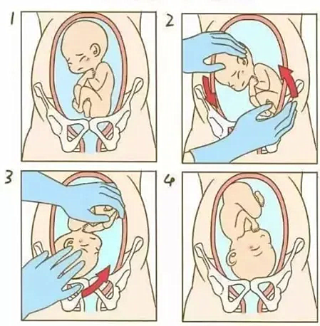 外倒转术(external cephalic version,ECV)是指通过在孕妇腹部的操作转动胎儿,使臀位或横位的胎儿转为头位,避免异常胎位阴道分娩造成的母儿不良损害,是降低剖宫产率的一项产科实用技术。由单人或双人操作。一只手扶住胎头,另一只手(或另一人)上推胎臀往宫底,完成“前滚翻”,如果失败,建议尝试“后滚翻”方向。建议在孕36周开始评估。孕37周开始可以进行外倒转术,足月后胎儿自发性倒转的可能性小,若未足月行外倒转,需权衡早产风险。