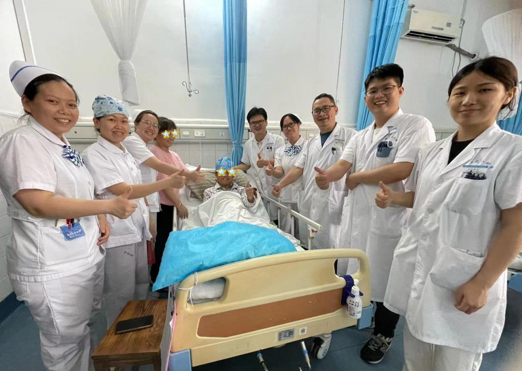 近日,神经外科副主任池超超及护士长石晶斌带领神经外科医护人员来到康复医学科对潘先生进行术后半年的随访。现在的潘先生和半年前几乎“胖若两人”,在医护人员们的精心照顾下,潘先生较前增重近15kg,现在的他正积极做着康复训练。