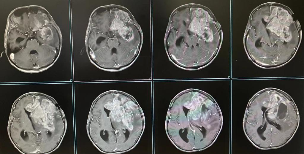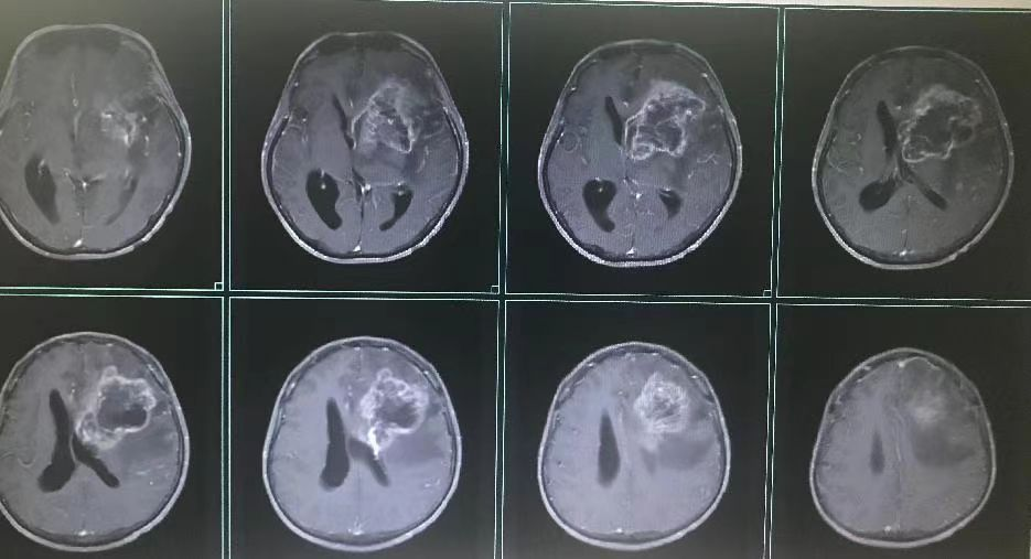 术后病理报告给出的结果明确了胶质母细胞瘤的诊断,但手术后潘先生没有进行放化疗、靶向药物诊疗及随诊,胶质母细胞瘤复发。在2023年的12月份,潘先生再次出现了肢体无力、意识模糊,再次来到了我院神经外科治疗,行头颅MRI提示:左侧基底节区-放射冠、双侧额叶、左侧颞叶及右侧脑室旁占位,考虑脑胶质瘤术后复发。