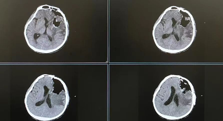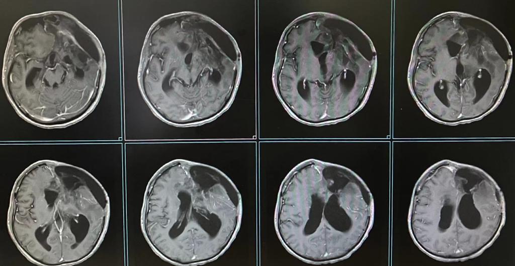 2023年的8月份,31岁的潘先生突发意识模糊,呼之不应,小便失禁,紧急送到我院诊治。行头颅CT提示:左侧额颞叶囊实性占位性病变并出血,头颅MRI提示:考虑额叶胶质瘤,大脑镰下疝形成。潘先生颅内的肿瘤直径达到70mm,肿瘤体积大,恶性程度高,又侵犯与肢体运动密切相关的脑功能区。