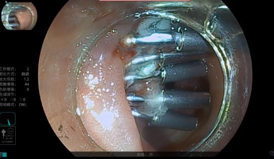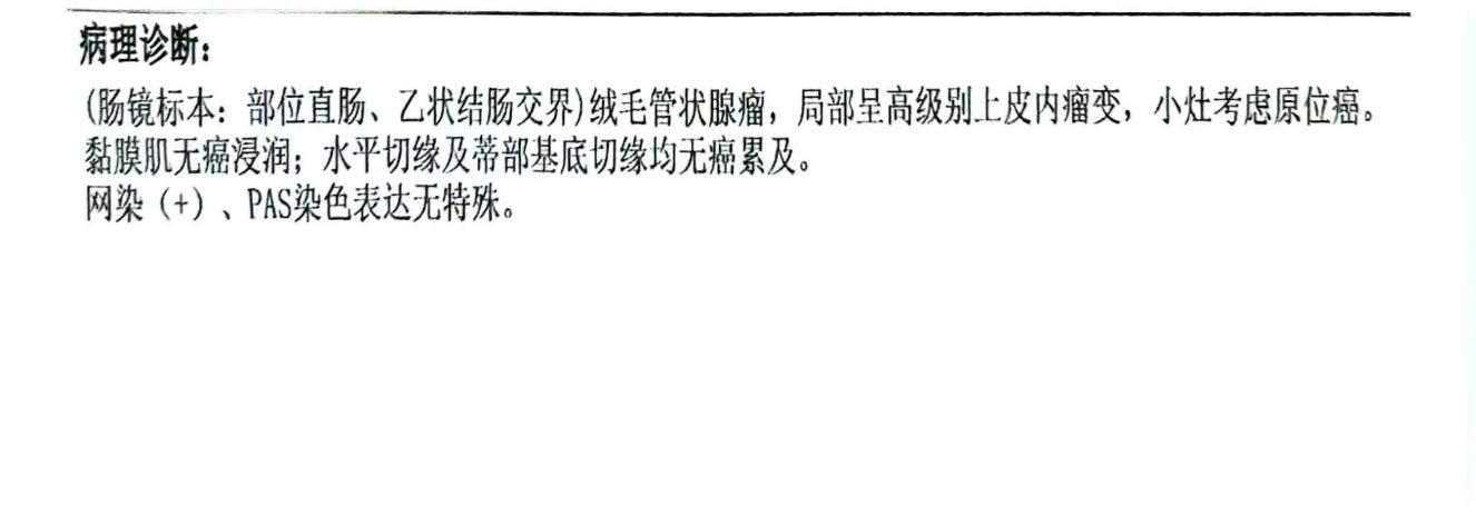 刘阿姨近几年来偶有大便带血,非常担心,遂来广西科技大学第一附属医院消化科就诊,医生建议行肠镜检查。检查见其肠道内有一大小约2.5x1.5cm息肉样肿物生长(如下图所示),初步病理活检提示绒毛管状腺瘤,因肿物较大,不除外有早期癌变可能,有内镜下治疗的指征。患者入住消化科进行内镜下手术治疗。消化科在麻醉科的配合下顺利完成了内镜下结肠黏膜剥离术(ESD),完整将这颗“定时炸弹”摘除。患者术后第二天就可以进食流质饮食,术后病理提示为绒毛管状腺瘤,局部高级别上皮内瘤变,小灶原位癌,切缘无癌浸润。术后没多久就康复出院。刘阿姨是不幸中的万幸,发现得较及时,通过内镜下切除肿物就达到了治愈早期结直肠癌的目的,且不需要追加外科手术和化疗。今后只需要保持良好的生活饮食习惯,定期复查肠镜即可。