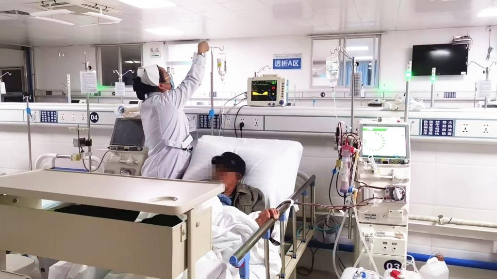 当时患者端坐呼吸,胸闷、气促,血压低,病情危重,检验科危急值提示血钾高达8.21mmol/L,肌酐820.7mmol/L,尿素氮35.42mmol/L。肾内科吴主任表示患者血钾高,随时有心跳骤停的危险,要立即行血液透析治疗。开通绿色通道,第一时间给患者插血透管,即刻予患者进行血液透析。患者在进行2个小时的急诊血透后,复查电解质显示,钾降至4.00mmol/L,胸闷症状较前缓解,抢救成功。患者家属表示多亏医院各科医生护士抢救及时,让老父亲转危为安,特表感激。