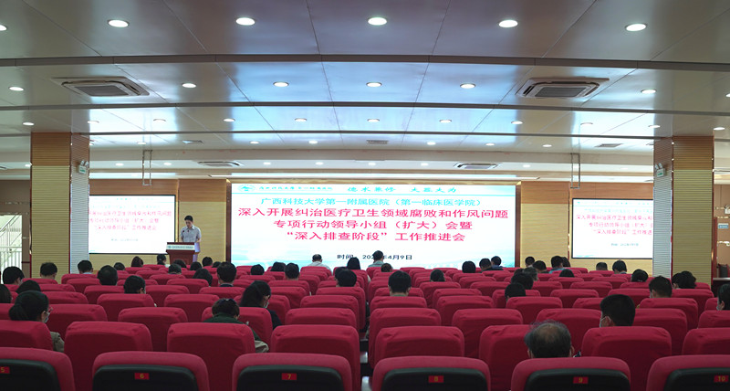 4月9日,广西科技大学第一附属医院(第一临床医学院)在学术报告厅召开深入纠治医疗领域腐败和作风问题专项行动领导小组(扩大)会暨“深入排查阶段”推进会。党委书记庞晓红,党委副书记、院长覃天进行讲话,党委副书记何曲波主持会议,纪委书记潘旭传达了上级部门落实专项行动电视电话会议精神。全院各党支部书记、中层干部及护士长共计100多人参加了会议。