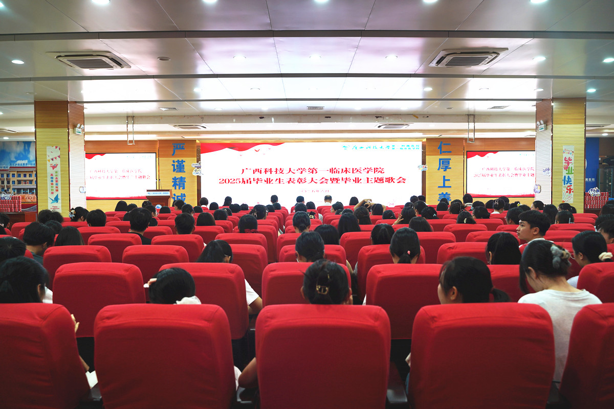 时光如梭从陌生到熟悉从青涩到成长每一步都留下弥足珍贵的回忆青春即将翻开新的篇章让我们以歌声为笺祝你前程似锦 6月26日晚,广西科技大学第一临床医学院2025届本科毕业生表彰大会暨毕业歌会在学术报告厅举行。学院(医院)党委副书记、院长覃天等院领导出席大会。学工办老师、毕业班班主任、辅导员及2025届全体本科毕业生参加大会。 首先,大家集体观看了一段毕业视频,共同回忆大学里珍贵的瞬间。接着,毕业班班主任依次寄...