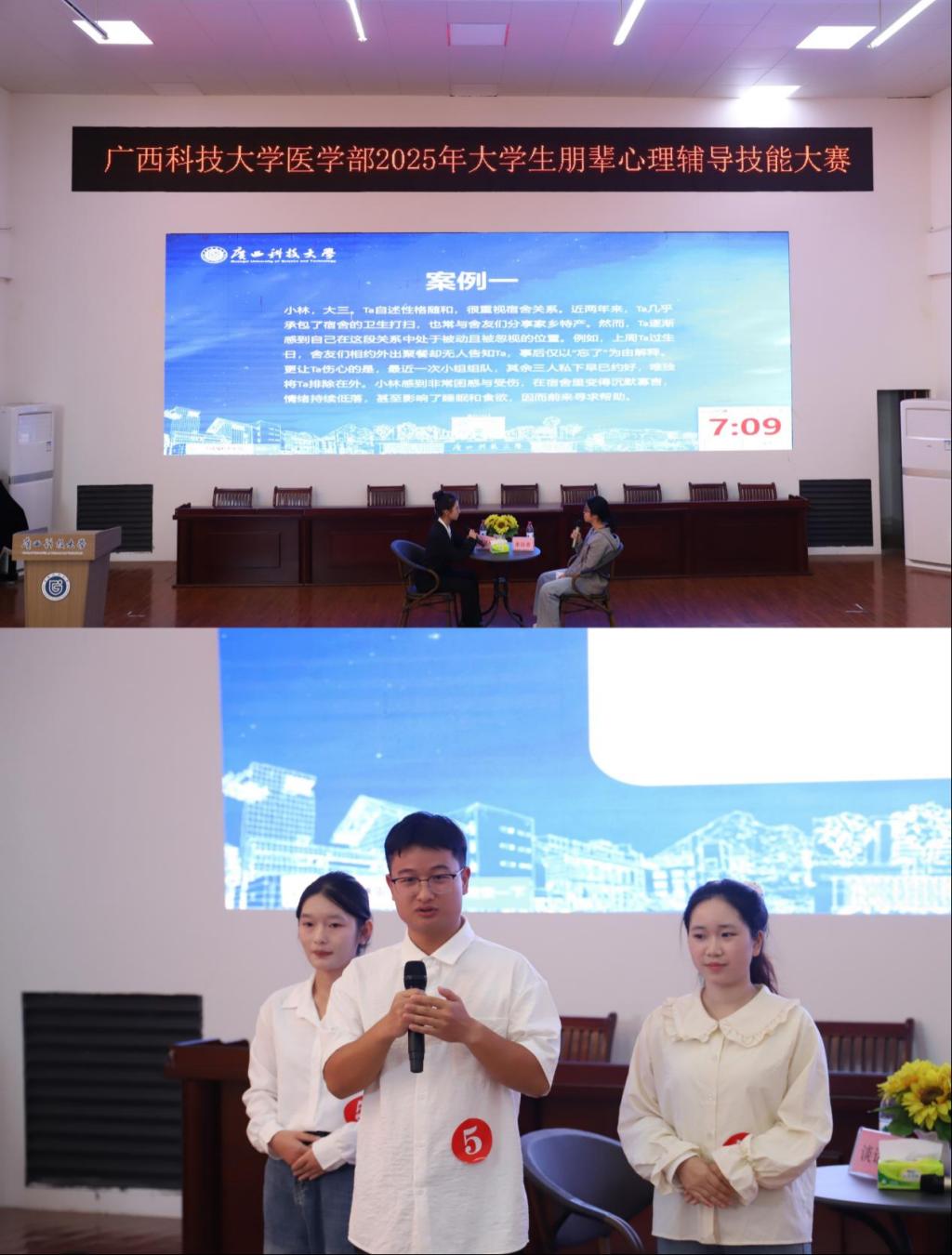 10月26日上午,由广西科技大学医学部主办、第一临床医学院承办的2025年大学生朋辈心理辅导技能大赛圆满落幕。本次大赛以"微光成炬,守望成长"为主题,不仅点燃了同学们关注心理健康的热情,更让大家看到"身边人帮身边人"的温暖力量。第一临床学院党委副书记、副院长何曲波老师出席比赛。 何曲波老师在开场致辞中欢迎了每一位到场的师生,她阐述了人文关怀对"未来白衣天使"们的重要性,指出朋辈心理辅导就像校园里的“小太阳...