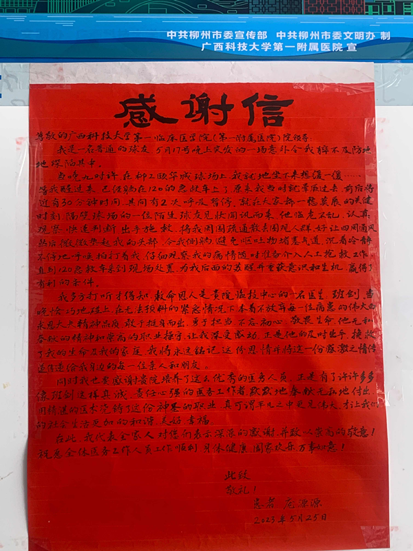 “感谢贵院培养了这么优秀的医务人员,这是有了许许多多像班剑这样真诚、责任心强的医务工作者,默默地奉献无私地付出,真可谓平凡之中更见伟大,才让我们的生活更加和谐、美好、幸福……”5月25日,在柳州从事销售工...