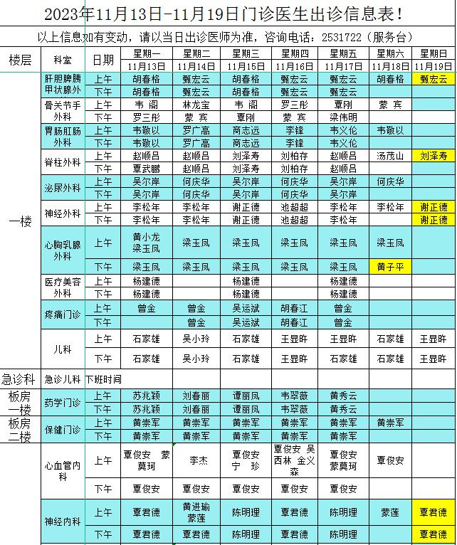 2023年11月13日-11月19日门诊医生出诊信息表
