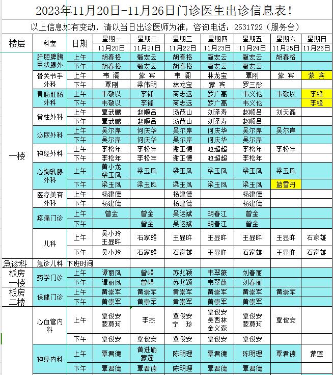 2023年11月20日-11月26日门诊医生出诊信息表
