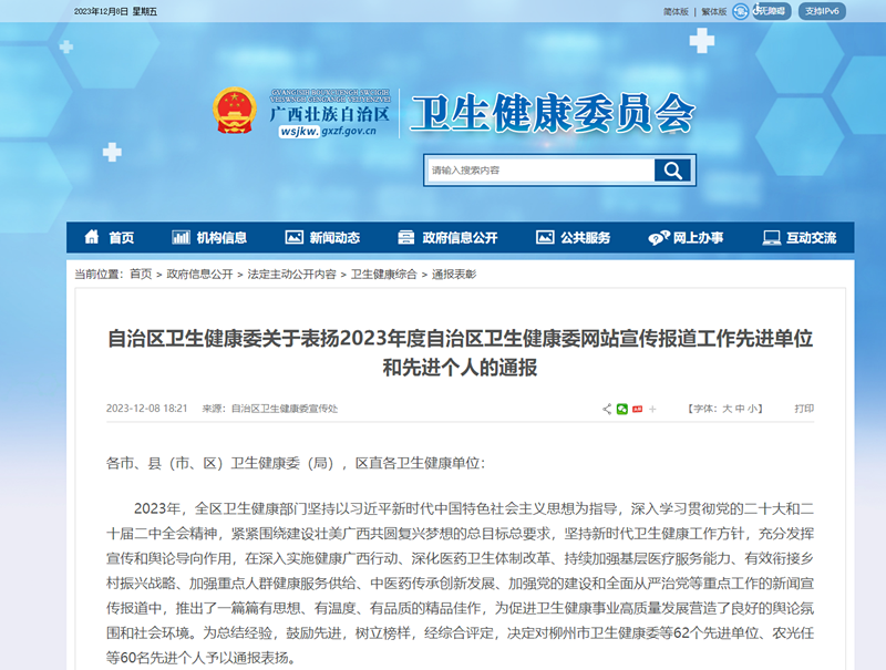 近日,广西壮族自治区卫生健康委发布了关于表扬2023年度自治区卫生健康委网站宣传报道工作先进单位和先进个人的通报,共有62个先进单位和60名先进个人表现优异喜获嘉奖!我院荣获“区直医疗卫生宣传通联工作先进单位...