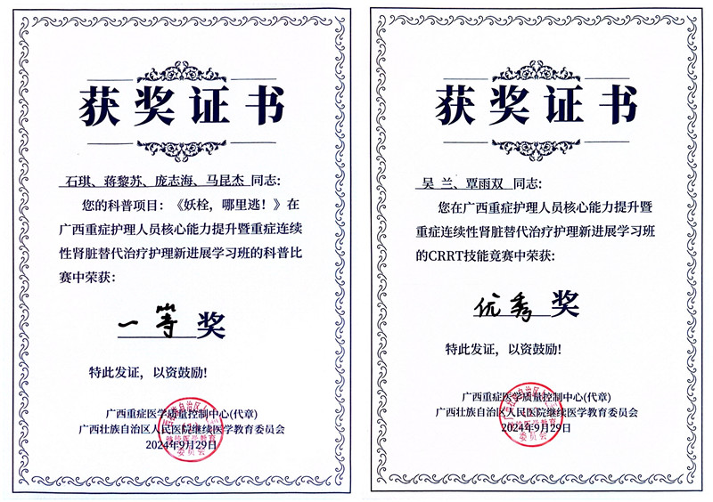 2024年9月27日至9月29日,第二届广西重症护理人员核心能力提升暨重症连续性肾脏替代治疗(CRRT)护理新进展学习班在南宁成功举办。我院重症医学科护理团队在护理科普案例比赛环节荣获一等奖,在连续性肾脏替代治疗(CRRT)技能竞赛环节荣获优秀奖。 在护理科普比赛环节,我院重症医学科石琪、蒋黎苏、庞志海、马昆杰、云妙妙带来的参赛作品《妖栓,哪里逃!》精彩亮相,与来自区内各级医院9支队伍,近30位优秀选手同台竞技。作...