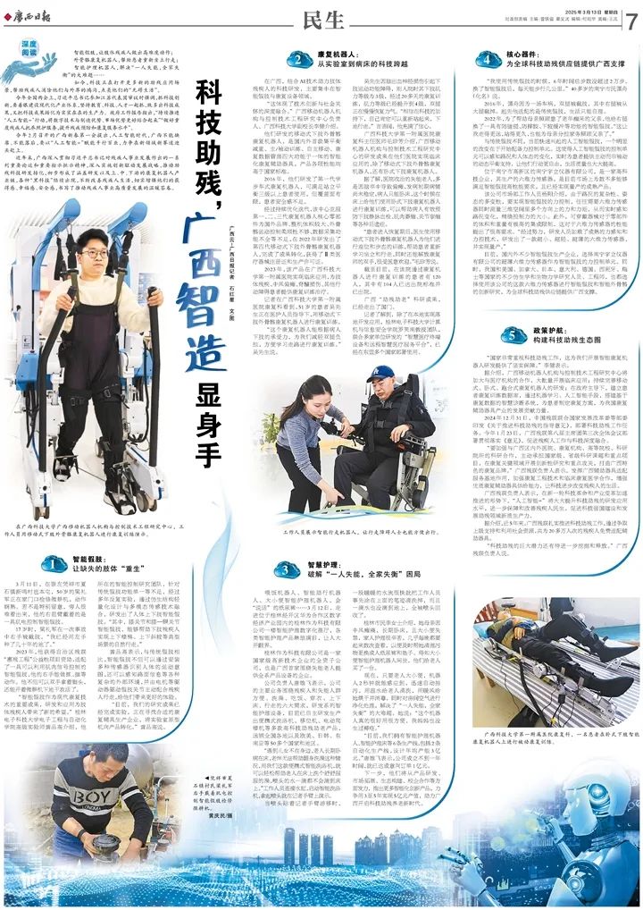 3月13日,《广西日报》7版以《科技助残,广西智造显身手》为题,专题报道了广西深入贯彻习近平总书记对残疾人事业发展作出的一系列重要论述和重要指示批示精神,深入实施创新驱动发展战略,推动助残科技研发转化,取得的新成效。其中,对广西科技大学广西移动机器人机构与控制技术工程研究中心(负责人:广西科技大学党委常委、副校长李健)研发的移动式下肢外骨骼康复机器人在医院实现临床应用作了报道。 现将文章部分内容转...