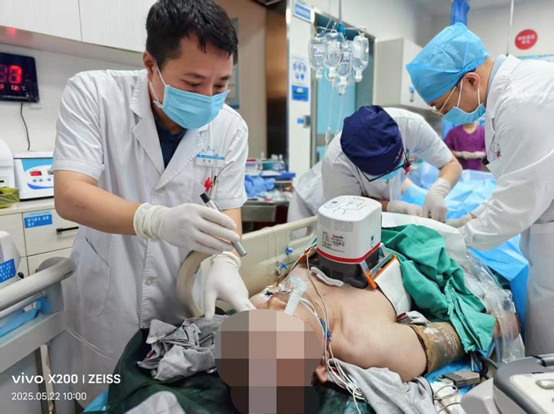 “白沙桥头附近有病人晕倒!120请出车!”2025年5月22日上午08:30分,急诊科廖维鑫医师与护士黄孝芳接120指令出诊,6分钟后到达在现场。只见一名男子躺在地上,全身大汗,面色苍白,表情淡漠,诉胸口疼痛。出诊人员评估后予快速建立静脉通道补液,打心电图有提示超早期急性心肌梗死可能,立即向急诊科预警并快速转运回院。(图为急诊科、ICU正在为患者心肺复苏) 08:51分回到急诊抢救室,患者烦躁不安,收缩血压才80mmHg左...