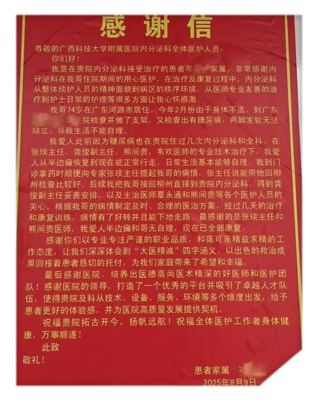 最近,我院内分泌科收到了一封特别暖心的感谢信!信里的每一个字,都饱含着患者和家属岑先生满满的感激,像冬天里的小太阳,把整个科室都照亮了,暖洋洋的! 今年2月份,岑先生的哥哥在外地医院检查发现心脏有问题,完善冠脉造影诊断动脉粥样硬化性心脏病并予支架植入治疗及球囊扩张术,做了支架手术(就是在心脏血管里放个小支架撑开血管)。祸不单行,还同时检查出糖尿病,哥哥出院后两腿发软,靠拐杖勉强能走,生活没法自...