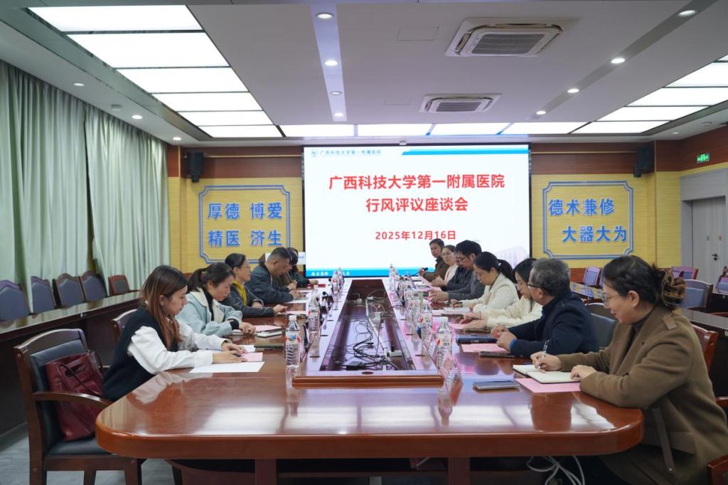 2025年12月16日下午,广西科技大学第一附属医院行风评议座谈会在临床技能教学培训中心B栋一楼会议室召开。会议以“倾听社会声音,提升服务质量,持续深化医院行风建设”为主题,邀请来自柳州市120急救中心、疾控中心、卫健局、医调委、媒体及社区的6位社会行风监督员齐聚一堂,为医院行风建设建言献策。医院分管副院长赵良军出席会议,医务部、护理部、门诊部、后勤保障科等相关职能部门负责人参加会议。会议由医务部部长张云...