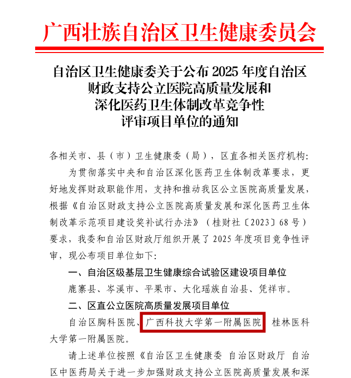 近日,广西壮族自治区卫生健康委员会公布的2025年度自治区财政支持公立医院高质量发展和深化医药卫生体制改革竞争性评审项目单位名单中,我院获评区直公立医院高质量发展项目单位。 此次我院是基于泛血管疾病全域全周期管理的医疗质量一体化提升与运营应用项目进行的申报。获评建设单位,标志着医院在推进公立医院高质量发展、深化医药卫生体制改革的实践道路上迈上了新台阶。今后我院将持续践行“以人民健康为中心”的宗旨...