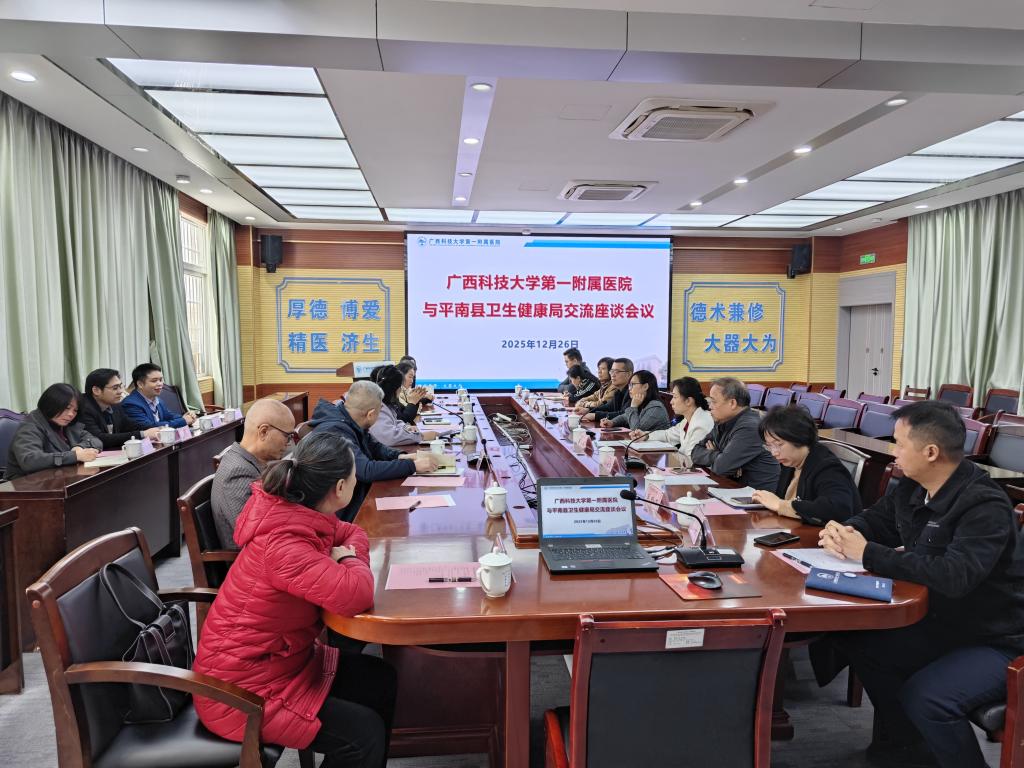 12月26日,平南县卫生健康局副局长刘紫丽带领辖区内平南县东华镇卫生院、平南康福医院领导班子成员及相关科室负责人等12人到访广西科技大学第一附属医院开展业务合作调研交流。此次交流旨在依托三级医院的优质资源与技术平台,探索深度合作模式,全面提升县域及基层医疗服务能力,特别是重点推动康复医学科与中医科学科建设与发展。我院党委副书记、院长黄进瑜,副院长陈瑞、银世杰出席会议。医院相关科室负责人、业务骨干等...