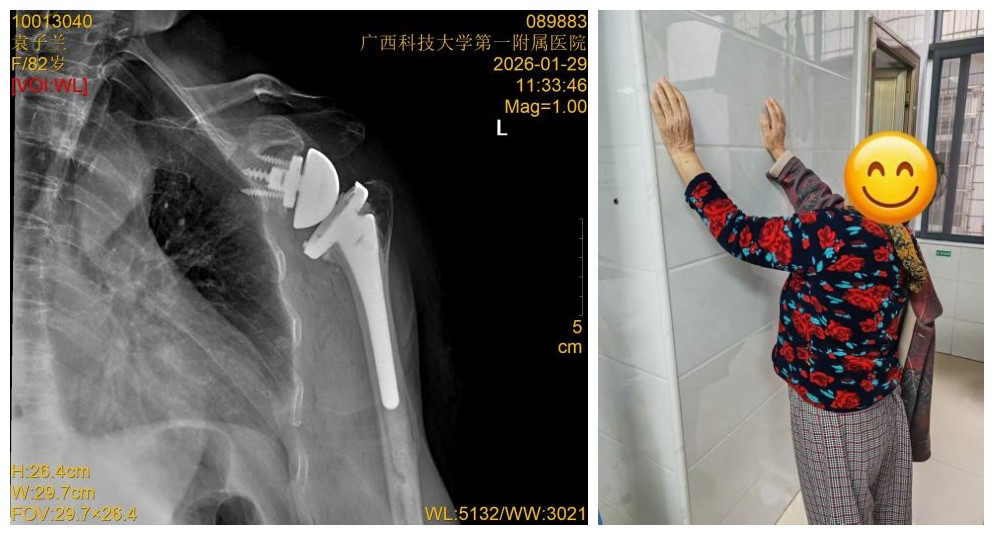 一场长达5年的左肩关节疼痛,让80岁的婆婆饱受煎熬,日常穿衣、梳头、抬臂等简单动作都成为难以完成的“奢望”,严重影响其生活质量。我院关节外科/运动医学科赵良军副院长、覃刚主任带领团队开展了医院首例反肩关节置换手术,手术成功实施标志着我院在严重肩关节疾病治疗领域实现了新的突破,达到区内先进水平。【案例介绍】 “左肩膀疼了5年,近半年越来越严重,胳膊抬不起来,夜里睡觉都睡不安稳。”这是婆婆满是无奈的...