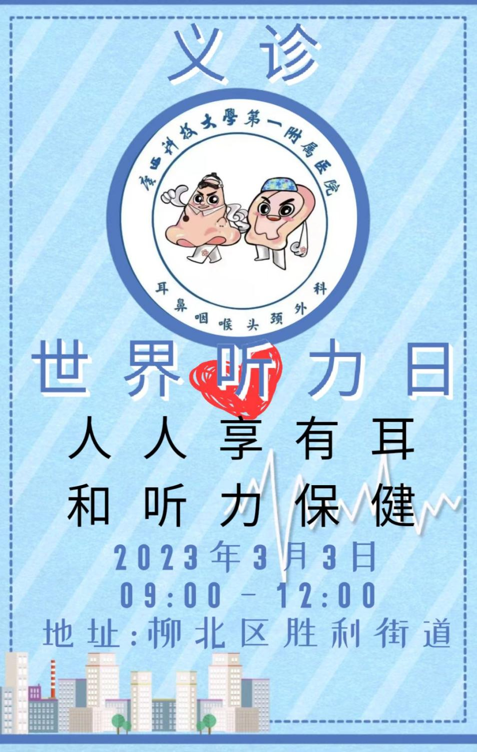 2023年3月3日是第24个“世界听力日”,今年的主题是“人人享有耳和听力保健”。广西科技大学第一附属医院耳鼻咽喉头颈外科将举办世界听力日义诊进社区活动,欢迎广大市民朋友们关注和参加! 1、时间 202...